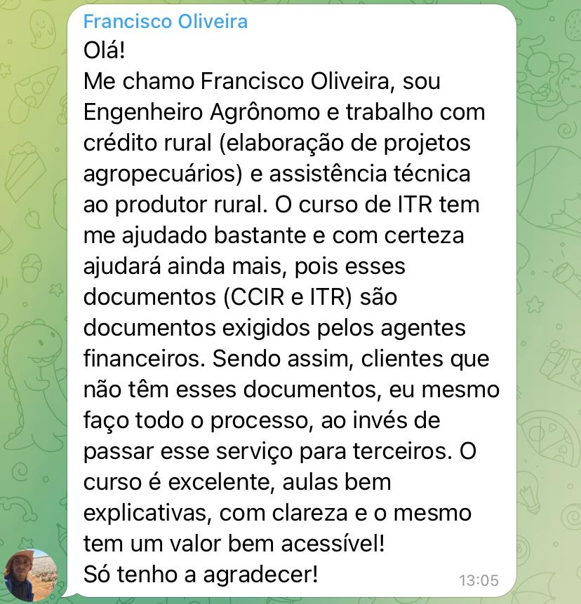 Criei o Curso Prático de ITR e CCIR com o objetivo de te mostrar que essa é uma ótima oportunidade de você dar o pontapé inicial na prática de serviços ao segmento rural e faturar muito com prestando esse serviço, mesmo que você não possua experiência alguma.